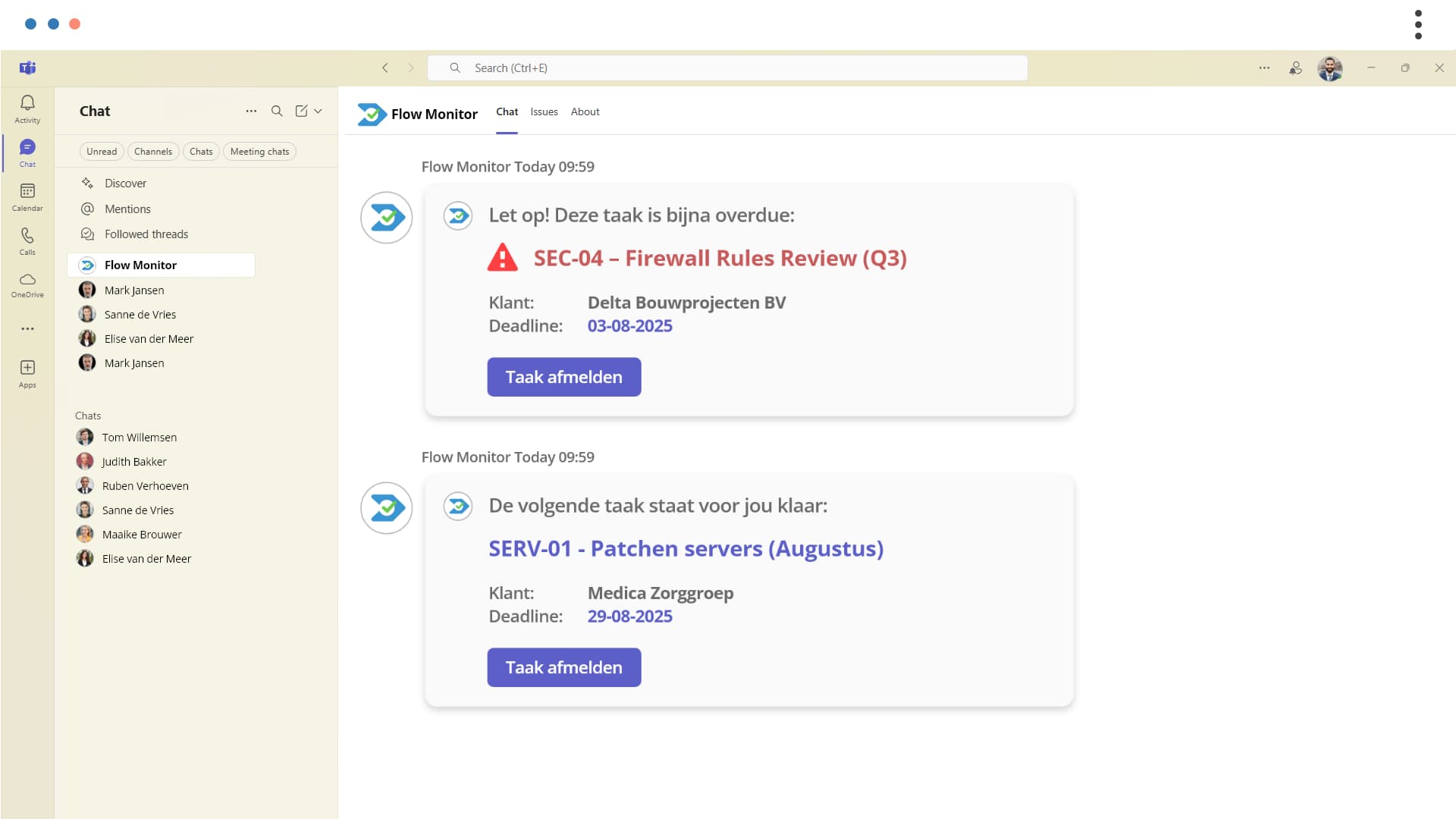Je collega's hoeven niet in nóg een ander systeem te werken. Alle taken verschijnen automatisch in Teams, precies waar ze al werken. Alleen de manager logt in op Flow Monitor om de voortgang van alle taken te bekijken. Dat scheelt tig keer vragen: “Hoe ver ben je?”