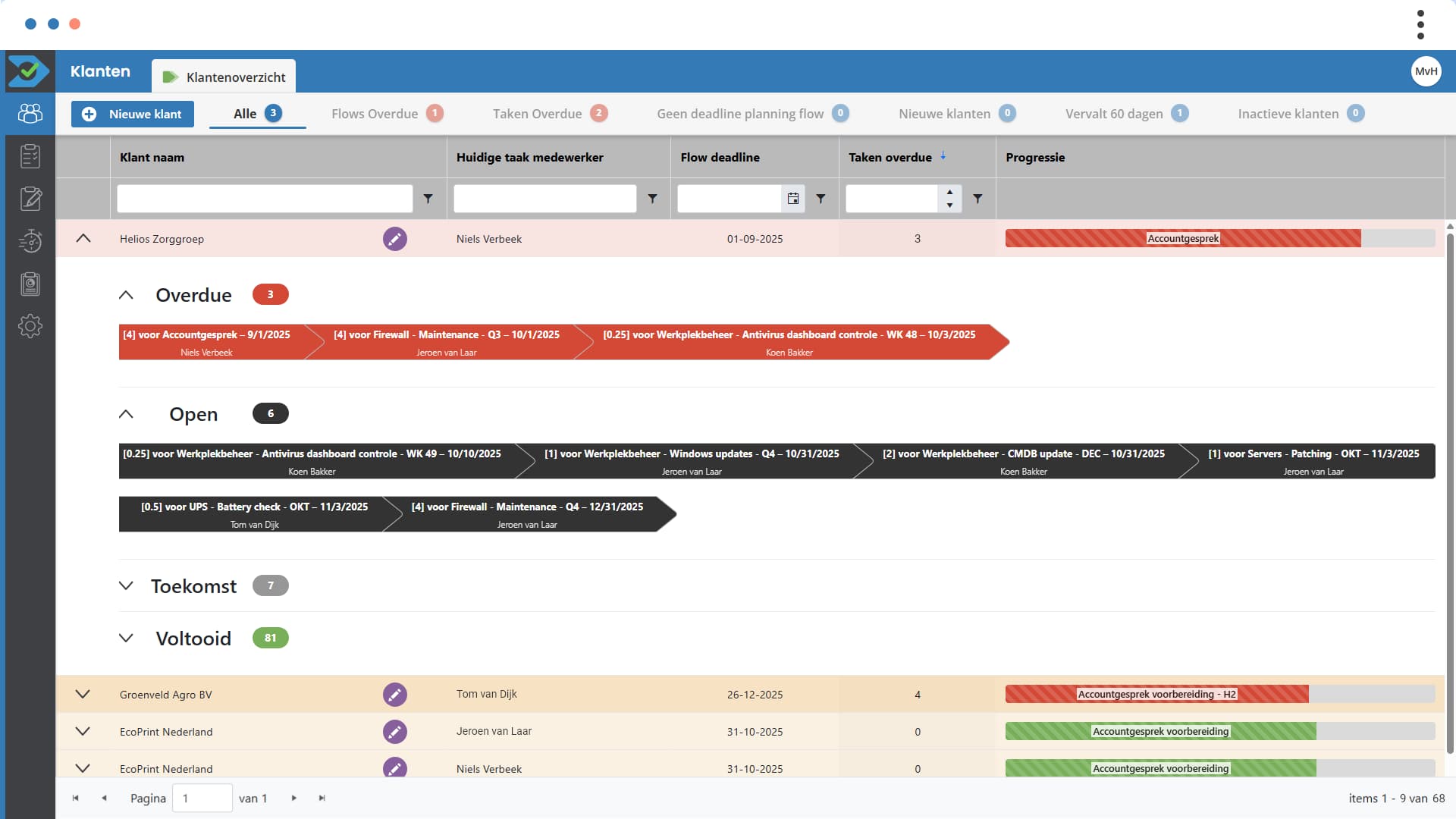 Als MSP maak je afspraken met klanten over SLA's, updates, installaties en onderhoud. Zet deze eenmalig in Flow Monitor en alle onderliggende taken worden automatisch ingepland. Van maandelijkse checks tot jaarlijkse audits: de planning voor je klant staat binnen minuten dankzij kant en klare workflows. En verandert op termijn een bestaande afspraak met een klant? Pas de deadline aan en alle subtaken verschuiven automatisch mee.